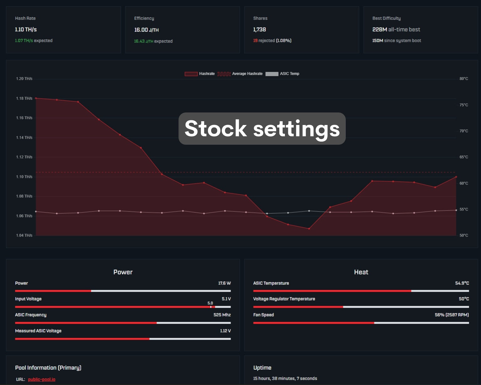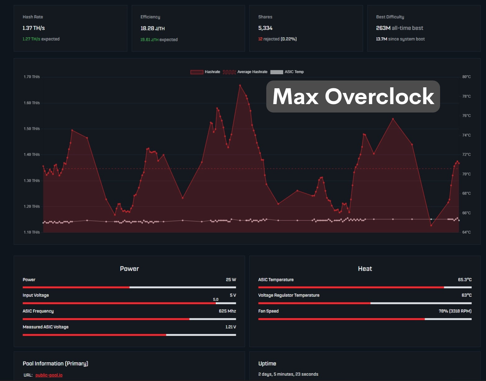 To test extreme conditions, we ran the Bitaxe Quiet Cool using maximum overclock settings for 48 hours in a real-world desktop setup (non-ideal airflow, nearby objects).